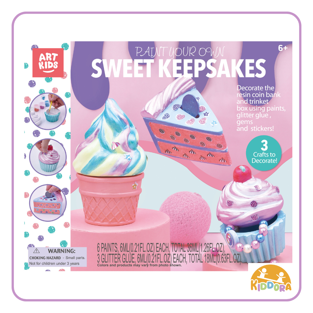 Let kids turn cupcakes, cakes, and sundaes into dazzling coin banks and trinket boxes with paints, glitter, stickers, and gems. A sweet way to boost creativity and coordination—perfect for proud little creators.