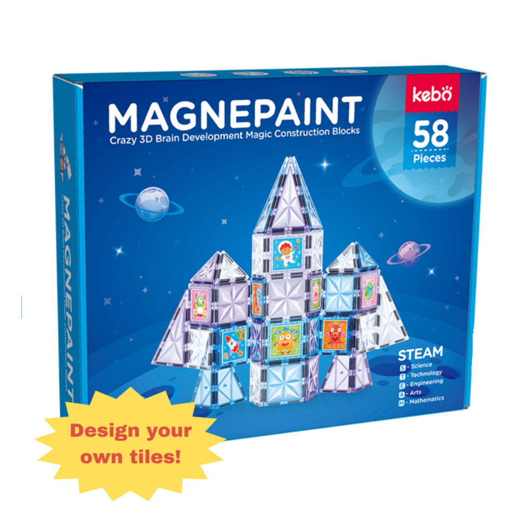 Kebo Magnepaint – Build, Paint, Create! Let kids unleash their inner artist with 58 magnetic tiles they can paint, stencil, and decorate. It’s a hands-on fusion of construction and creativity—where every tile becomes a masterpiece
